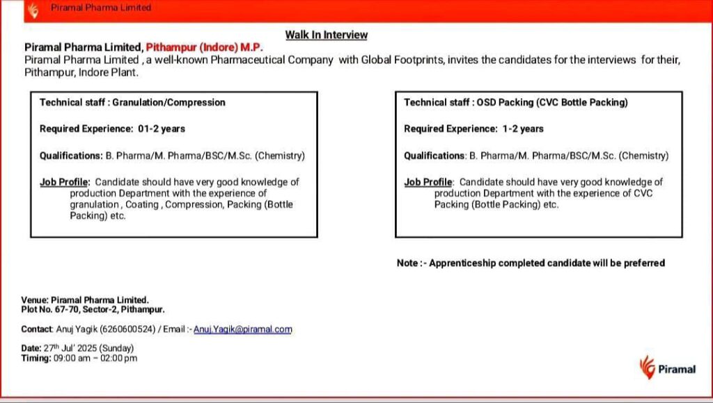 Piramal Pharma Limited, a well-known Pharmaceutical Company with Global Footprints, invites the candidates for the interviews for their, Pithampur, Indore Plant.