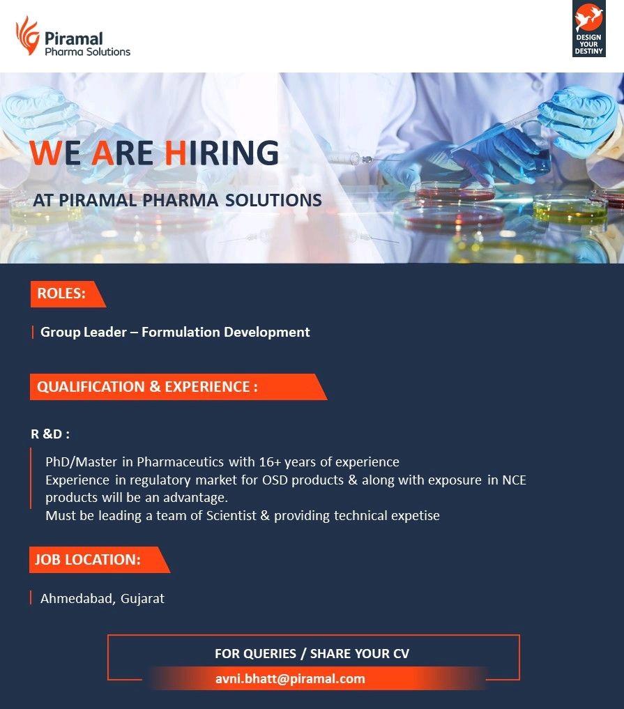 PIRAMAL PHARMA hiring Group Leader – Formulation Development || Apply Now
