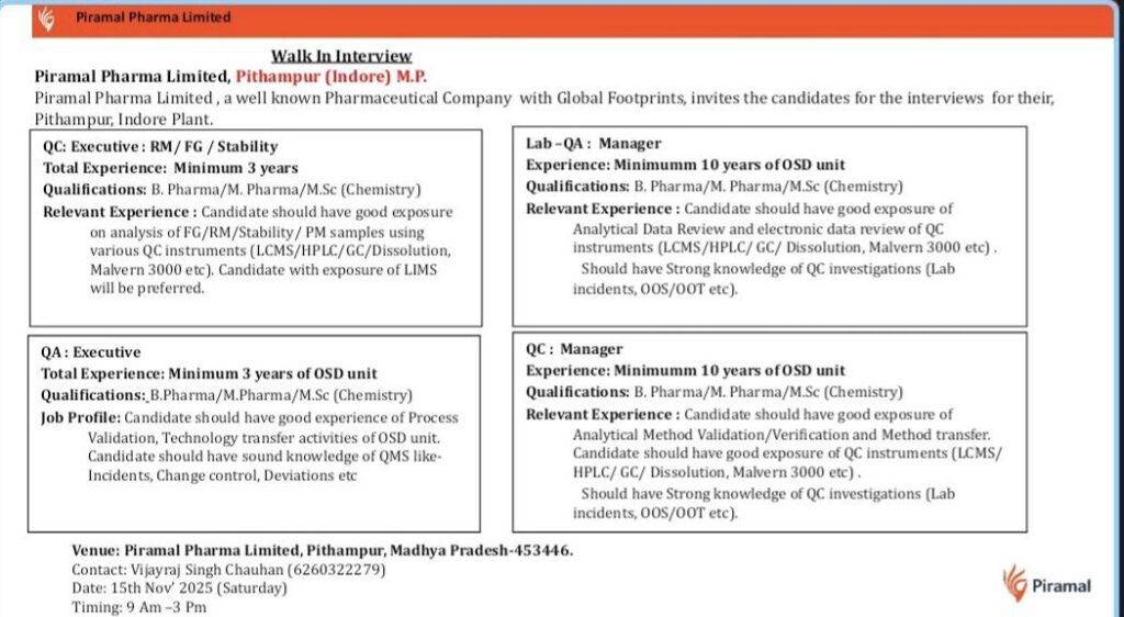 Piramal Pharma Limited, a prominent pharmaceutical company with a global presence, has announced a walk-in interview for multiple positions at its manufacturing facility in Pithampur, Indore, Madhya Pradesh. The company is seeking experienced professionals for various roles in Quality Control (QC) and Quality Assurance (QA) departments.
