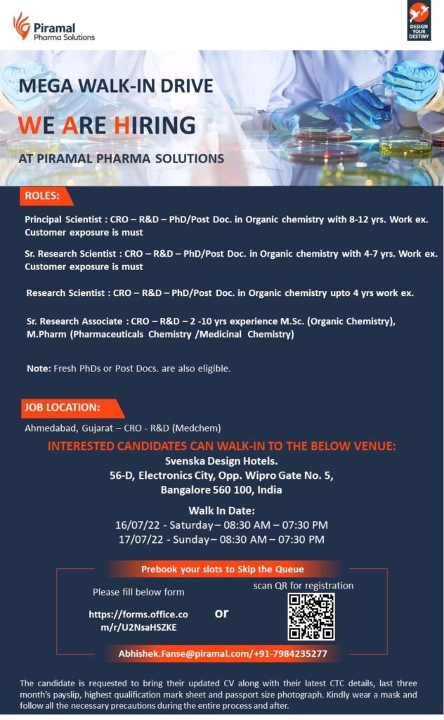 Piramal Pharma Ltd. Mega Walk In Drive in Bengaluru for Multiple Open Positions for CRO – R&D department on 16th & 17th July 2022
