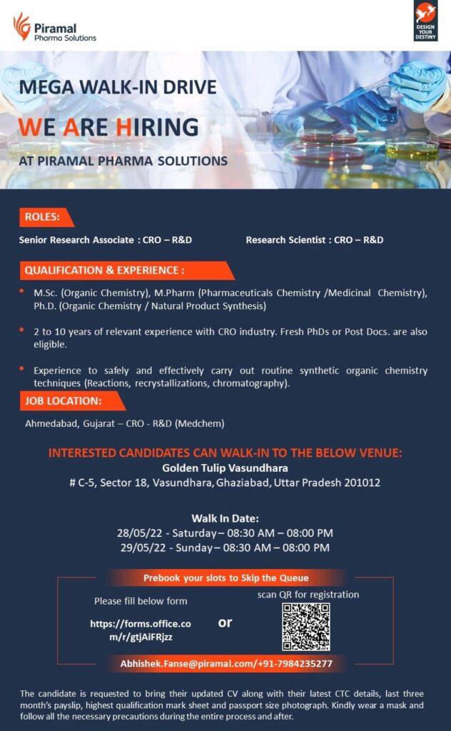 PIRAMAL PHARMA MEGA WALK-IN DRIVE for CRO – R&D on 28th & 29th May 2022