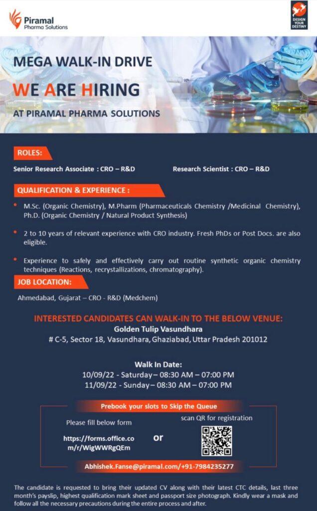 PIRAMAL PHARMA Mega WALK-IN DRIVE in Noida for Multiple Open Positions for Medchem R&D CRO on 10/09/22 & 11/09/22