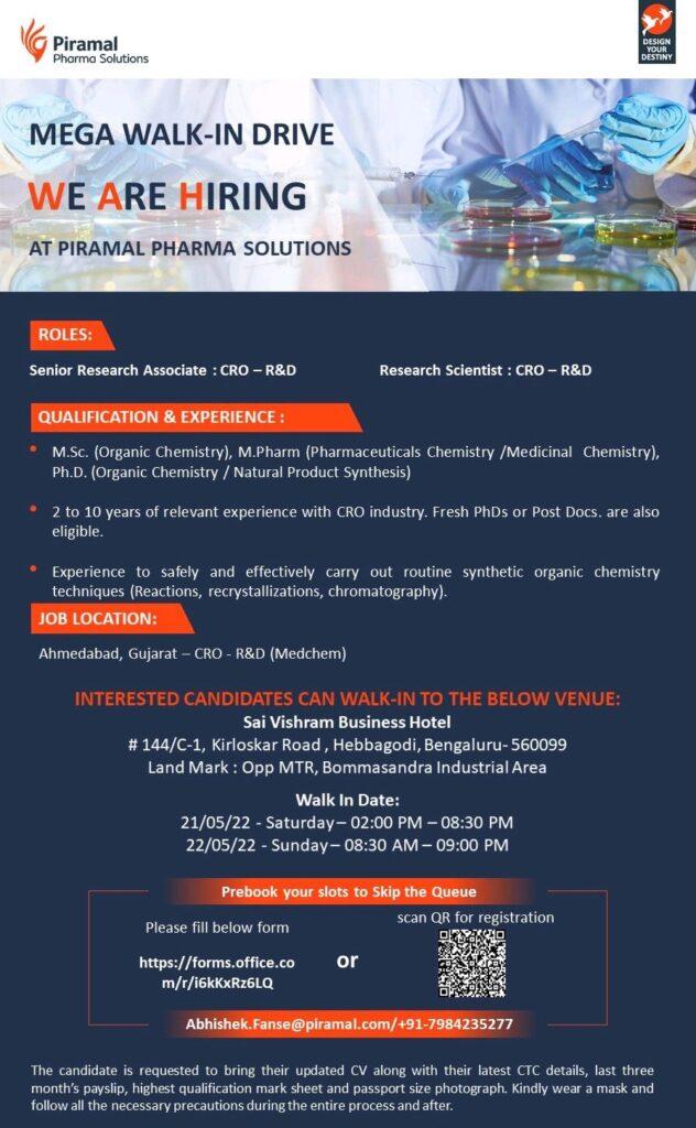 PIRAMAL PHARMA SOLUTIONS MEGA WALK-IN DRIVE in BENGALURU on 21/05/22 & 22/05/22