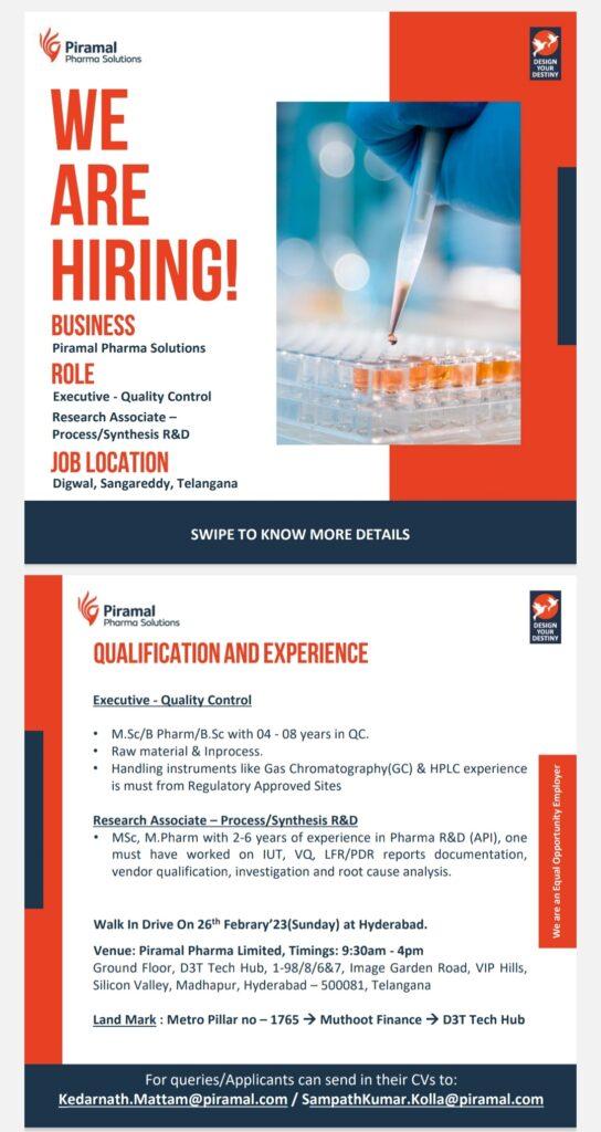 For queries/ Applicants can send in their CVs to: Kedarnath.Mattam@piramal.com/ Sampathkumar.Kolla@piramal.com