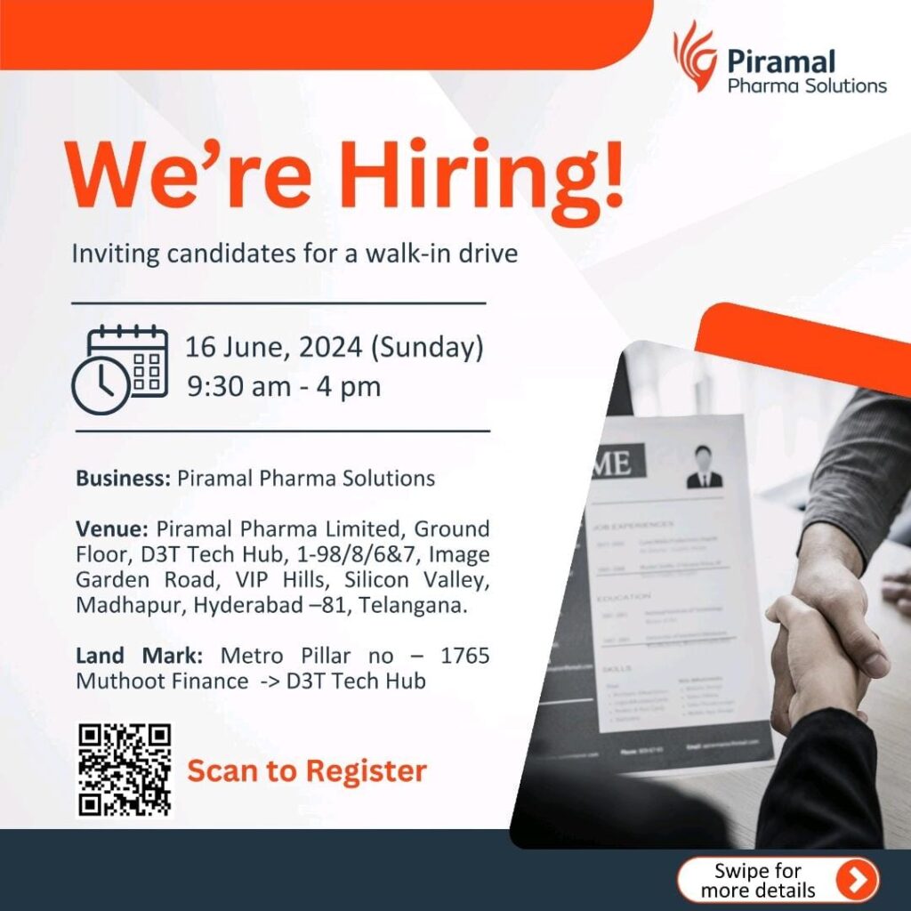 Piramal Pharma walk-in drive on 16th June, 2024 (Sunday) @ Hyderabad