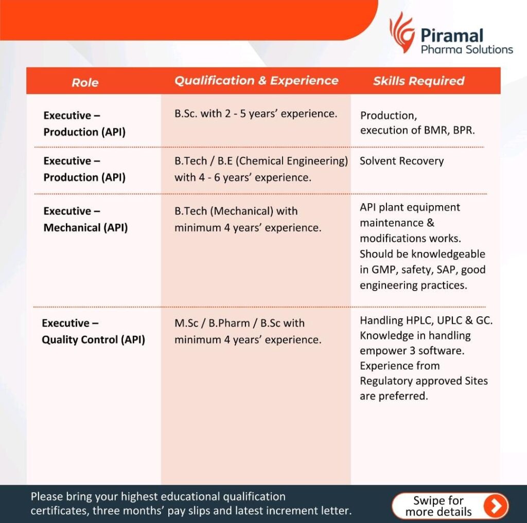 Piramal Pharma walk-in drive on 30th June 2024 (Sunday)