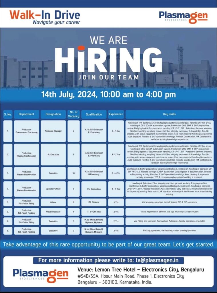 PlasmaGen BioSciences (P) Ltd Walk-in Interviews on 14 July, 2024 (Sunday)