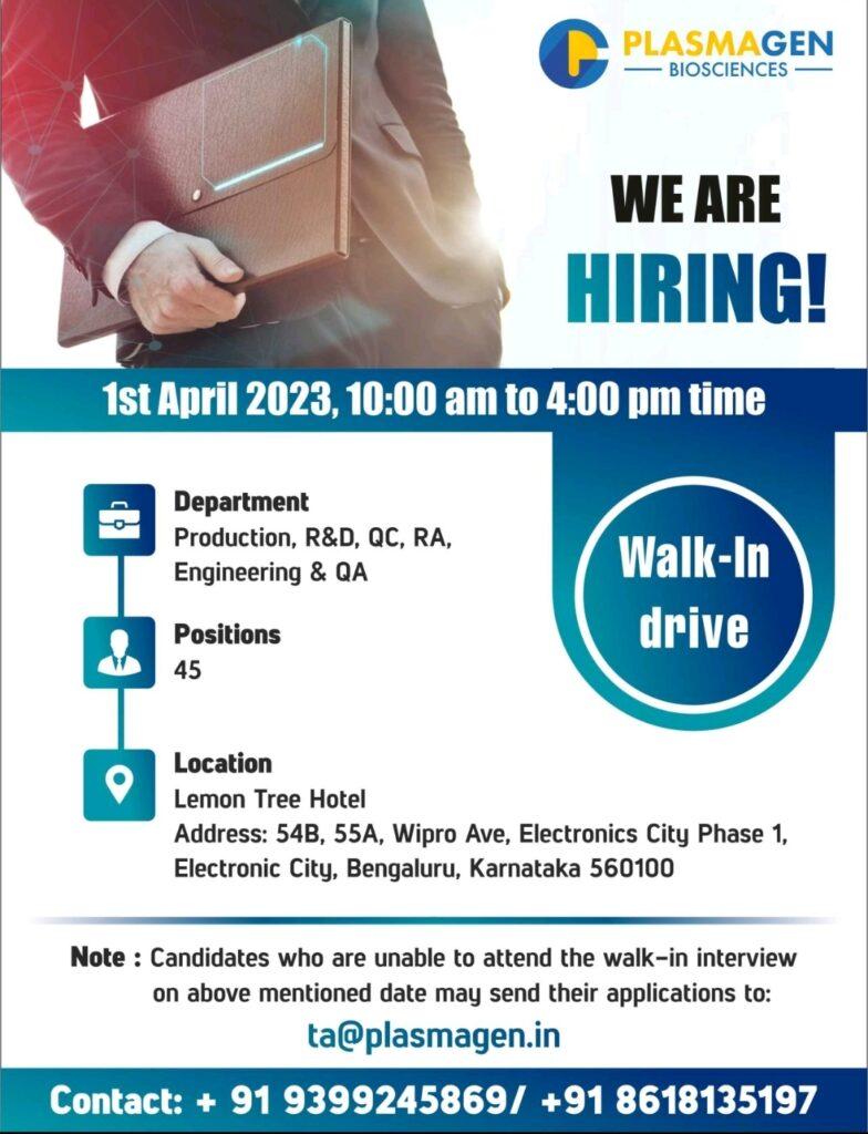 PlasmaGen BioSciences invites all aspiring professionals for a Walk-In-Interview Drive on 1st April 2023 for multiple roles and skills.