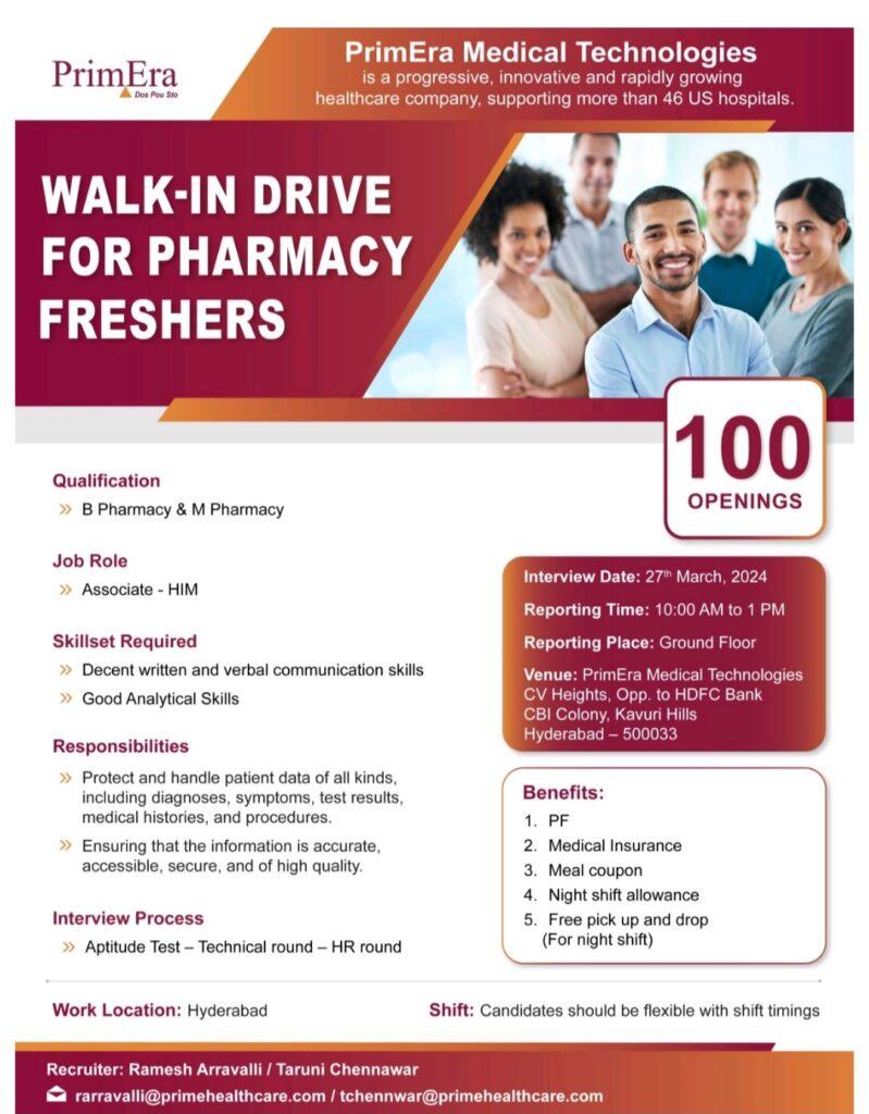 PrimEra Medical Technologies is hiring B Pharma & M Pharma Freshers for the role of Associates, If interested please walk in for interview to our office CV Heights Madhapur, on 27th March 2024(Tomorrow) Between 10.00 AM to 1.00 PM