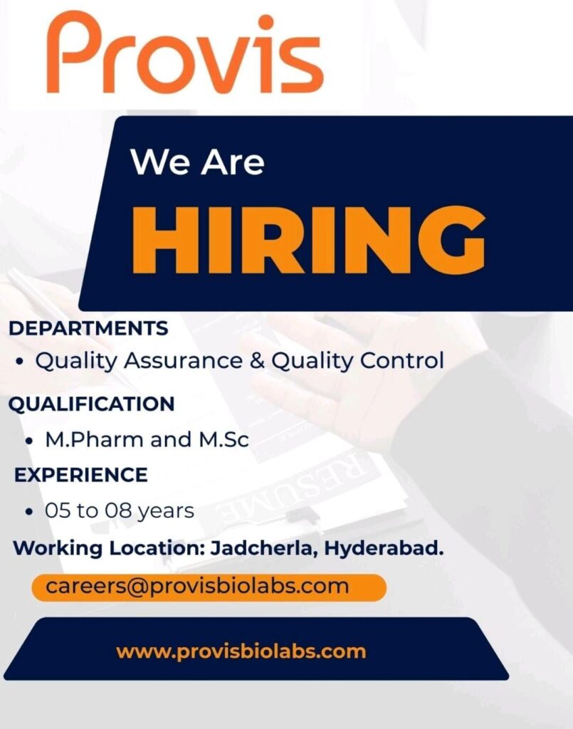 Provis Bio Labs, a leading name in the pharmaceutical sector, has announced new job opportunities for experienced professionals in Quality Assurance (QA) and Quality Control (QC). This is an excellent chance for well-qualified talent to join a fast-growing and innovation-driven organization.
