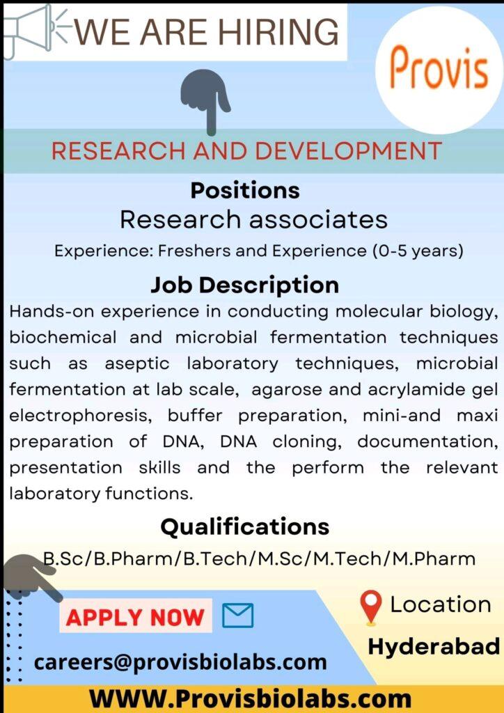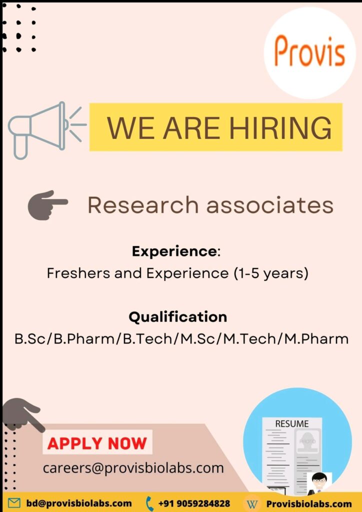 Provis Biolabs is Hiring B.Sc/B.Pharm/B.Tech/M.Sc/M.Tech/M.Pharm Freshers and Experience for Research Associates ||Apply Now