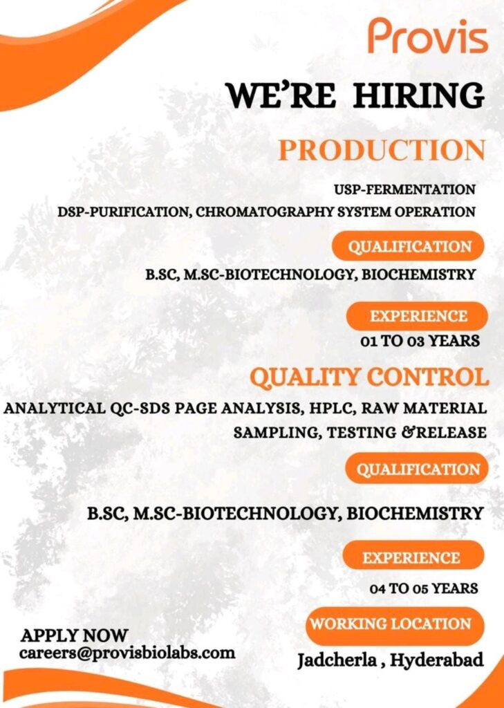 Provis Biolabs, a growing name in the biotechnology sector, has announced multiple openings for skilled and passionate candidates in Production and Quality Control (QC) departments. This is a great opportunity for individuals looking to build a rewarding career in the biopharmaceutical and biochemical industries.