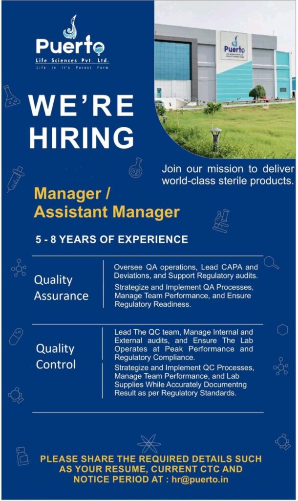 Puerto Life Sciences is actively hiring for several key positions in their Quality Assurance (QA) and Quality Control (QC)