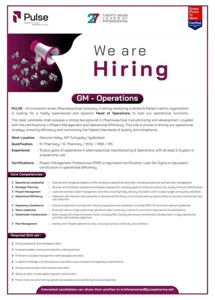 PULSE hiring for GM – Operations at Genome Valley, Hyderabad location