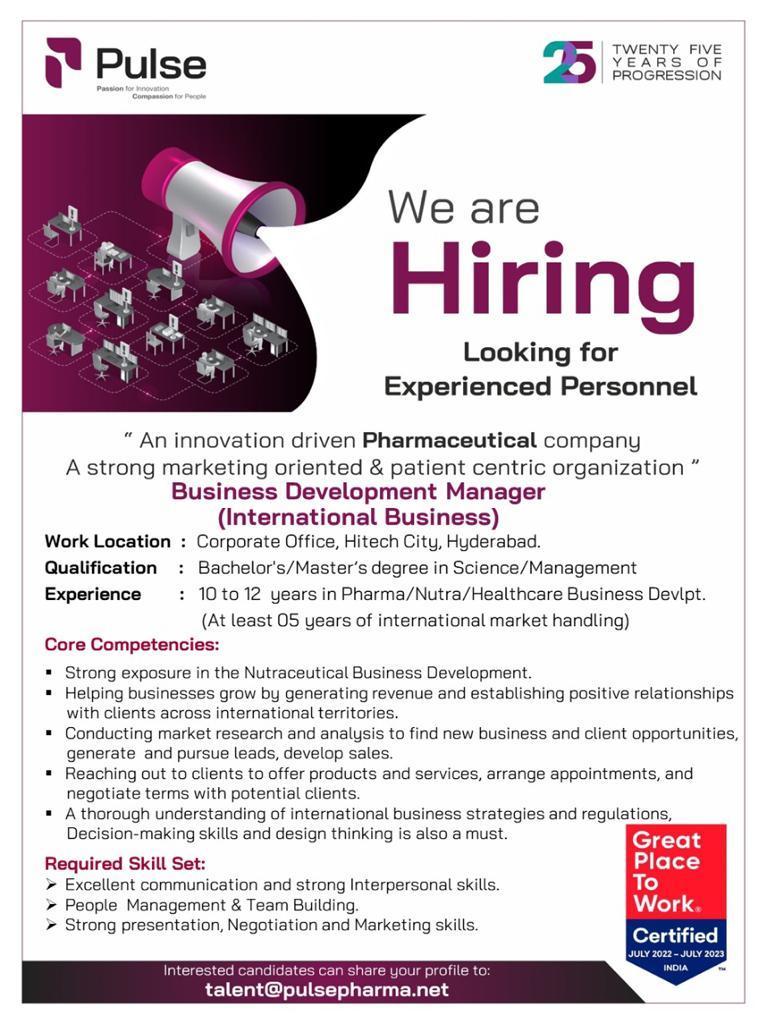 Pulse Pharma hiring for Business Development Manager – International Business