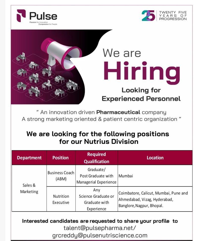 We are looking for below positions to work in Pulse Nutri Science at different locations. Interested candidates can share their Resume to below mentioned Mail ID.