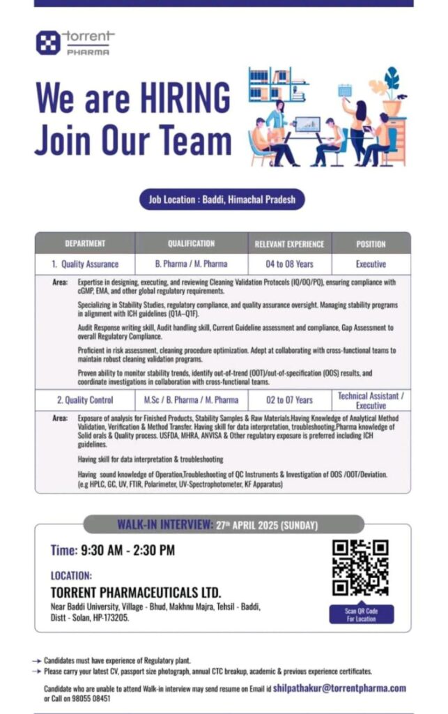 Candidate who are unable to attend Walk-in interview may send resume on Email id shilpathakur@torrentpharma.com