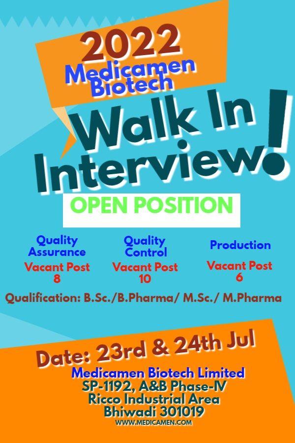 Walk In @ Medicamen Biotech Limited on 23rd & 24th Jul 2022 (Sat. & Sun.)