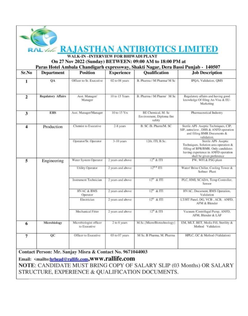 RAJASTHAN ANTIBIOTICS Walk In Interview for QA, Regulatory Affairs, EHS, Production, Engineering, Microbiology & QC on 27 Nov 2022