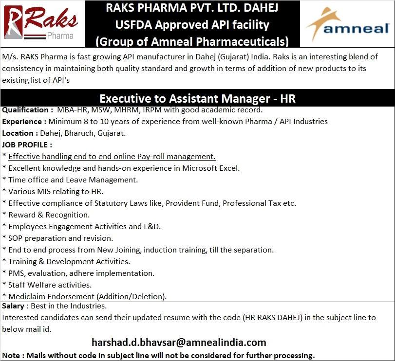 RAKS PHARMA PVT. LTD. DAHEJ hiring Executive to Assistant Manager – HR department