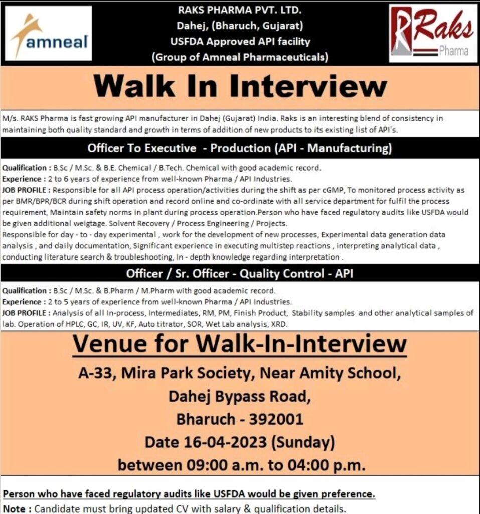 RAKS PHARMA PVT. LTD Walk In Interview for Officer To Executive – QC, Production (API – Manufacturing) on 16-04-2023 (Sunday)