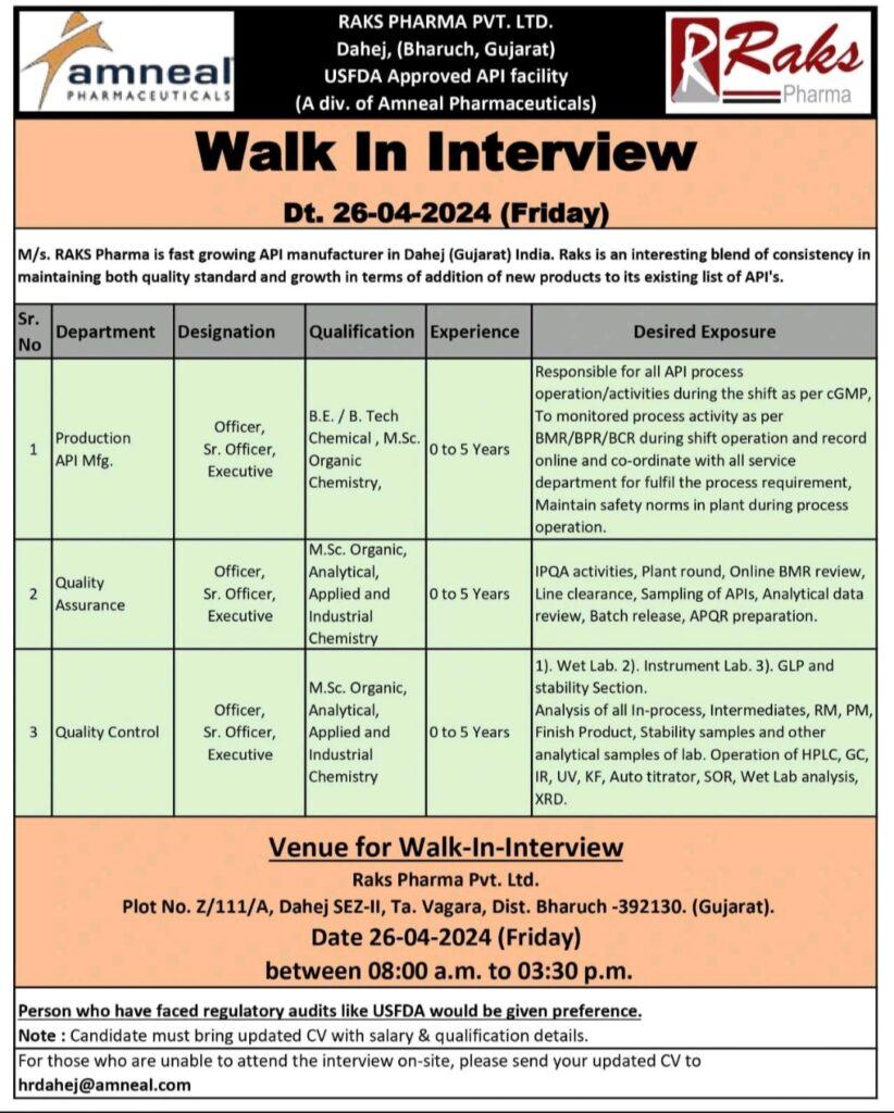 Exciting opportunities await at Raks Pharma Pvt Ltd Dahej! Join us for a walk-in interview for positions in API Manufacturing, Quality Control, and Quality Assurance departments. Take the next step in your career with us!