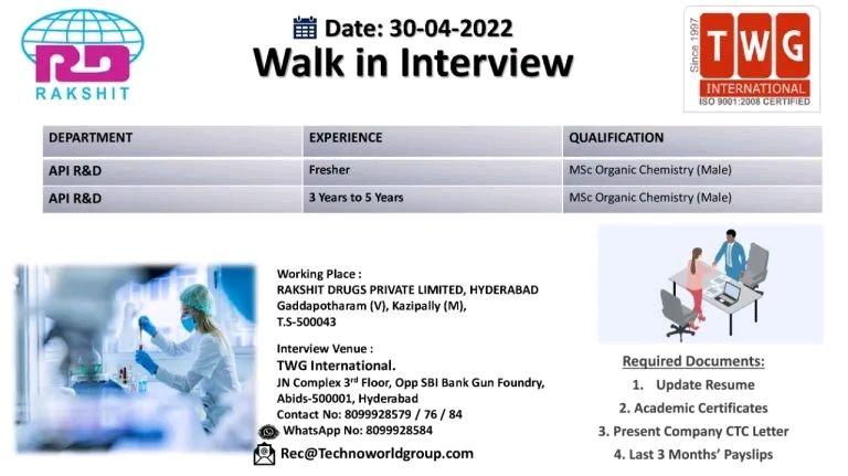 RAKSHIT DRUGS Walk in Interview for Freshers & experience on 30-04-2022 @Hyderabad