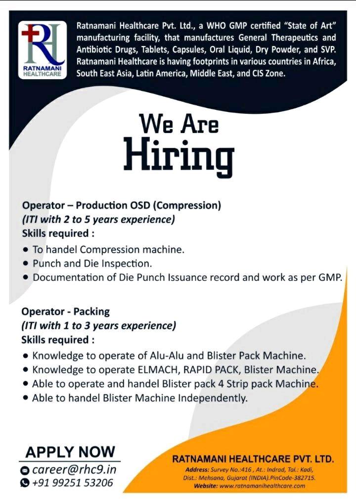 Ratnamani Healthcare hiring for Operator – Production OSD (Compression) & Packing department