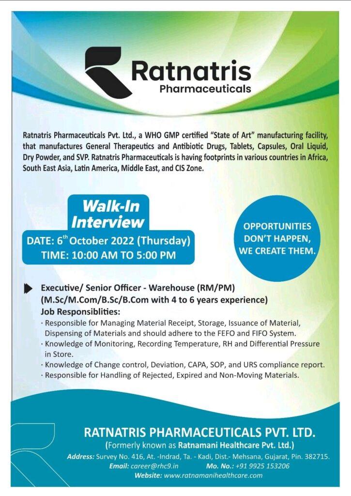 Ratnatris Pharmaceuticals Walk-In Interview for Executive/ Senior Officer – Warehouse (RM/PM) on 6th October 2022