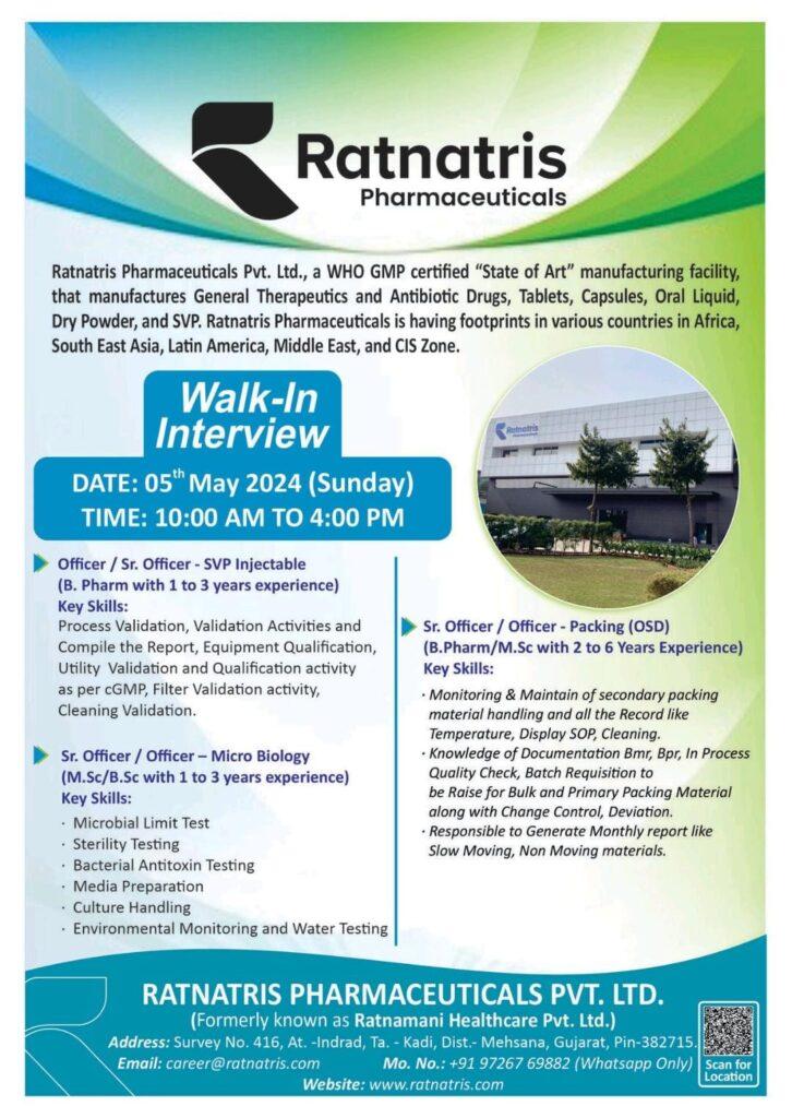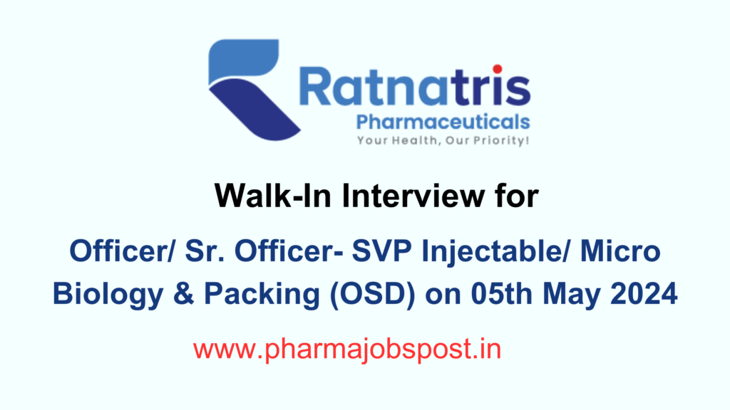 Ratnatris Pharmaceuticals Walk-In Interview for Officer/ Sr. Officer-SVP Injectable/ Micro Biology & Packing (OSD) on 05th May 2024 (Sunday)