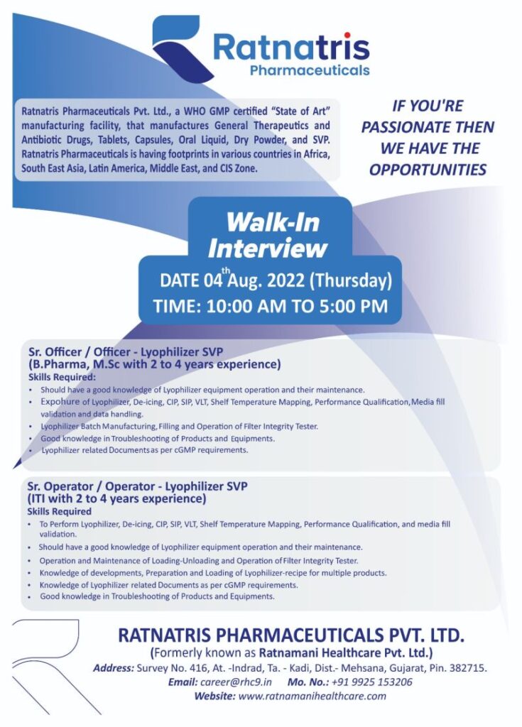 Ratnatris Pharmaceuticals Walk In Interview for Sr. Operator/ Operator/ Sr. Officer/Officer – Lyophilizer SVP on 04 Aug. 2022