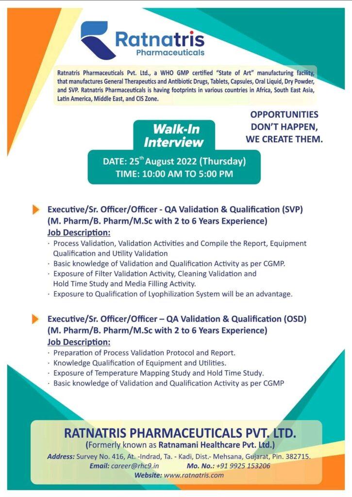 Ratnatris Pharmaceuticals Walk-In Interview for Executive/Sr. Officer/Officer – QA Validation & Qualification (SVP)/ (OSD) on 25th August 2022
