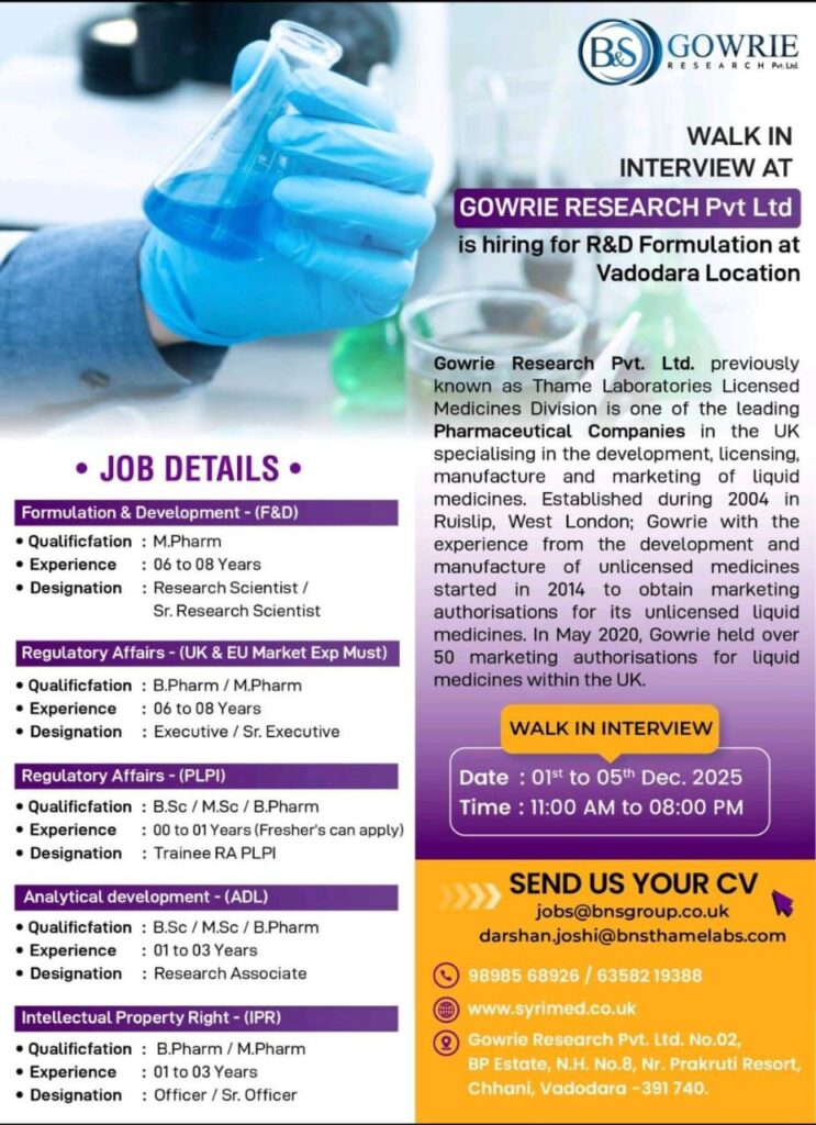 Gowrie Research Pvt. Ltd., a key division of the UK-based Thame Laboratories Licensed Medicines, is conducting a massive walk-in interview drive for its Vadodara location. Gowrie specializes in the development, licensing, manufacture, and marketing of liquid medicines, holding over 50 marketing authorisations in the UK.