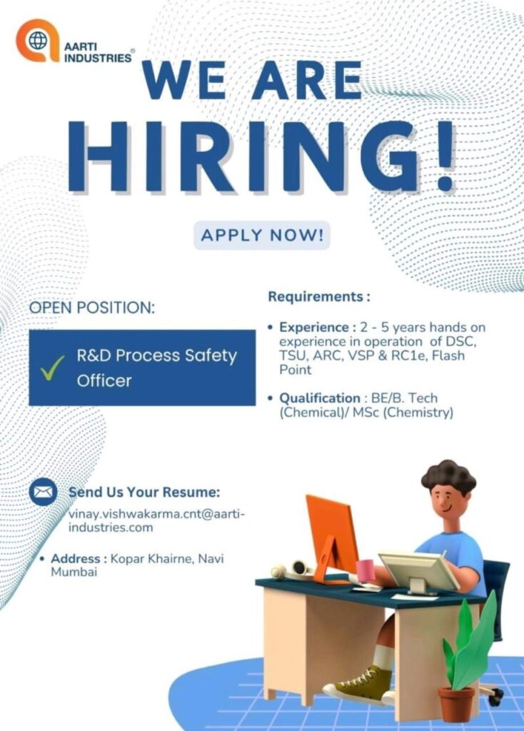 Aarti Industries, a leading name in the chemical manufacturing sector, is currently hiring for the role of R&D Process Safety Officer at its Kopar Khairne facility in Navi Mumbai. This is an exciting opportunity for professionals passionate about chemical safety and innovation.