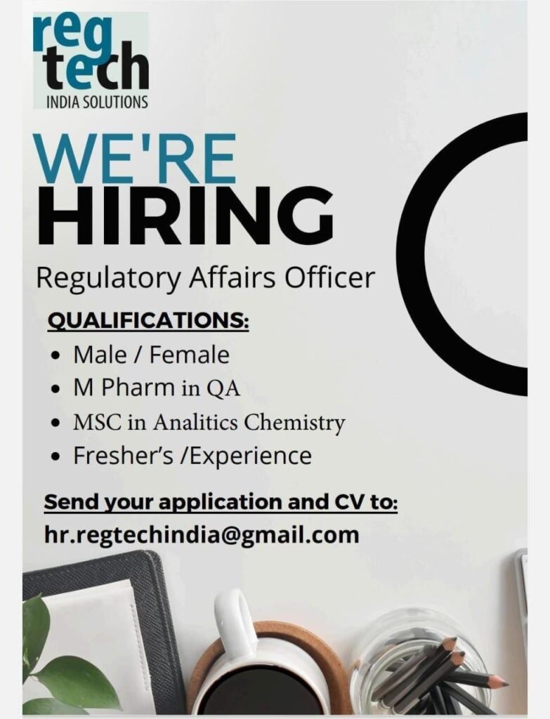 Job opportunity with Reg Tech India Solutions for a Regulatory Affairs Officer position aimed at freshers. Regulatory Affairs Officer works to ensure that products, services, or business operations comply with the relevant laws and regulations.