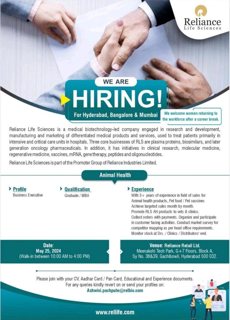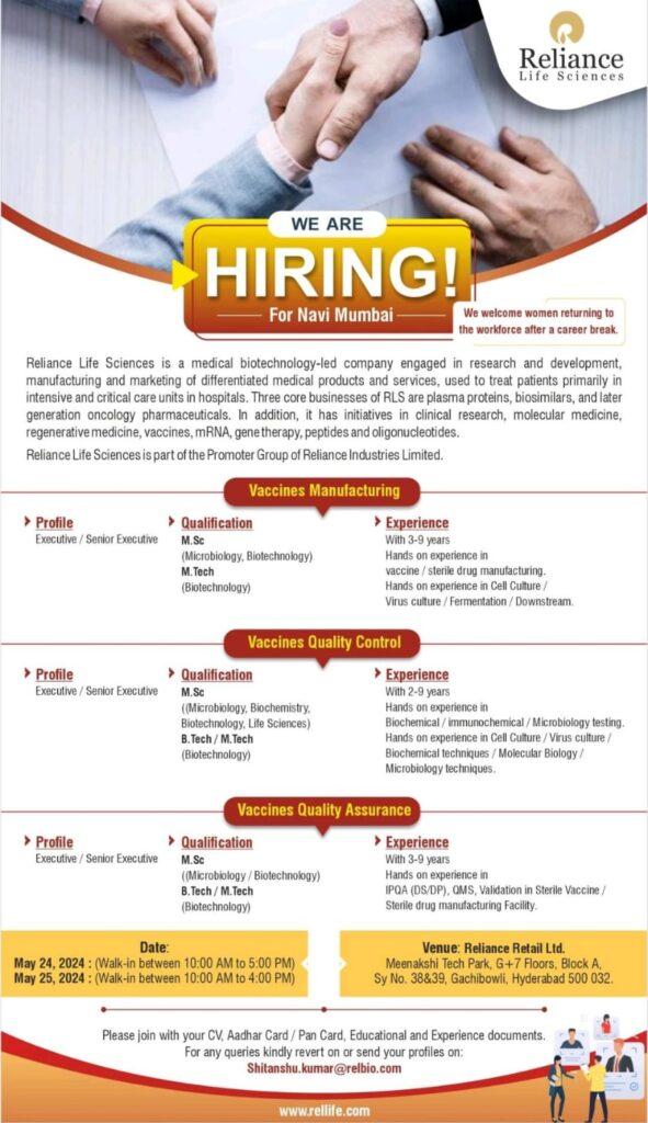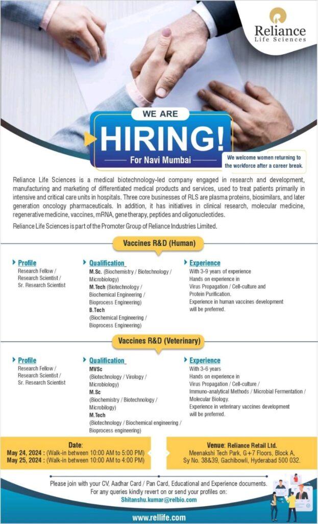 Reliance Life Sciences walk in interview for Manufacturing, QA, QC, R&D, Animal Health on May 25, 2024 @ Hyderabad
