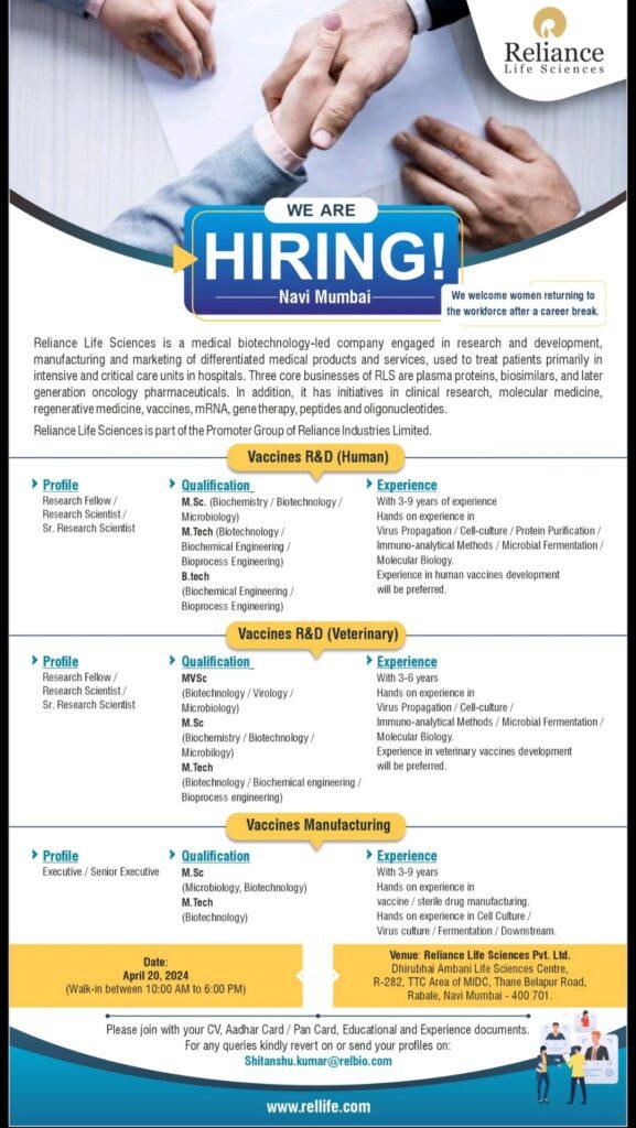 Reliance Life Sciences walk in interview for multiple openings in R&D, Vaccines Manufacturing on April 20, 2024