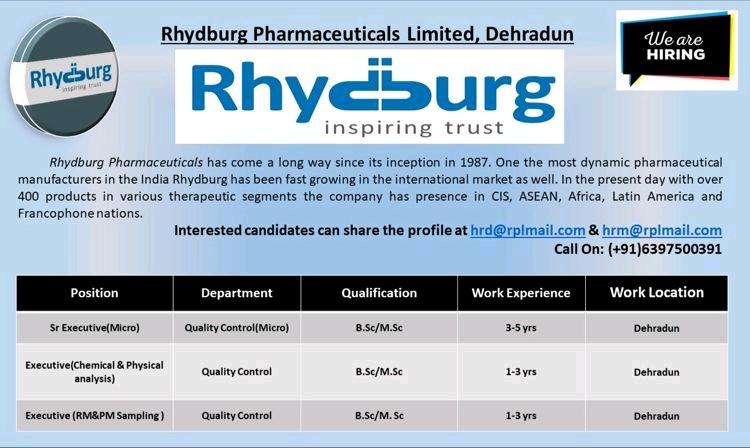 Rhydburg Pharmaceuticals hiring for Executive, Sr.Executive- Quality Control department