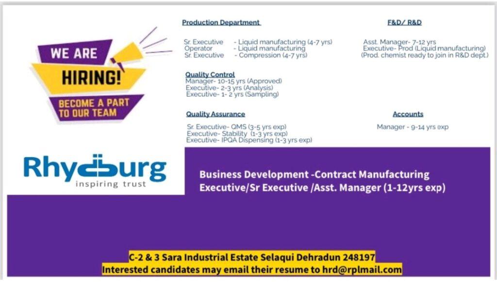 Rhydburg pharmaceuticals job vacancy for Production, QA, QC, F&D/ R&D, Accounts, Business Development department