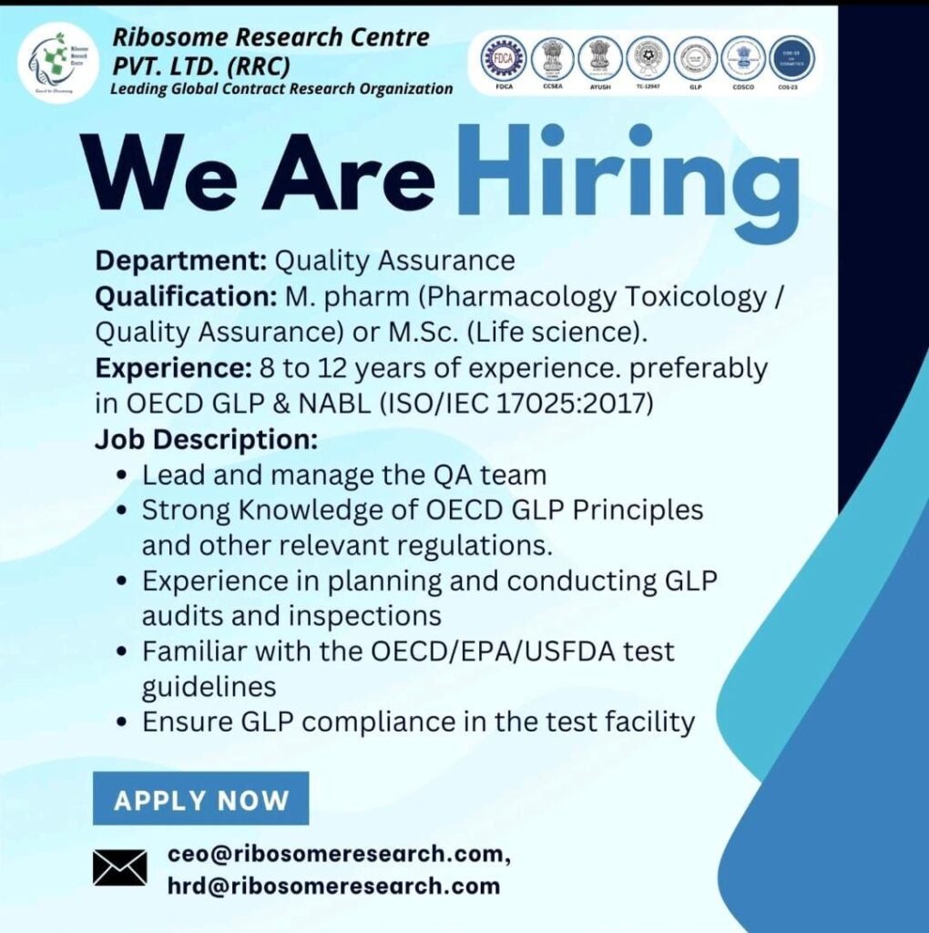 Ribosome Research Centre Pvt. Ltd. (RRC), a leading global Contract Research Organization, has announced an excellent career opportunity for experienced professionals in Quality Assurance. The organization is known for its high-quality research standards and adherence to global regulatory practices, making this a strong opportunity for candidates looking to advance in QA leadership roles.