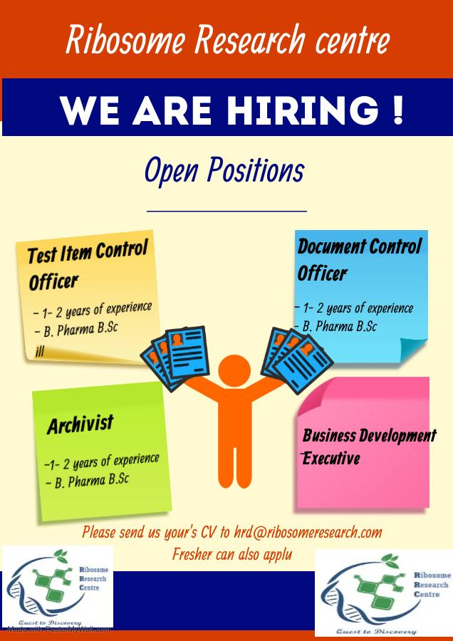 Ribosome Research centre hiring for Test Item Control Officer, Document Control Officer, Archivist, Business Development Executive -Fresher can also apply