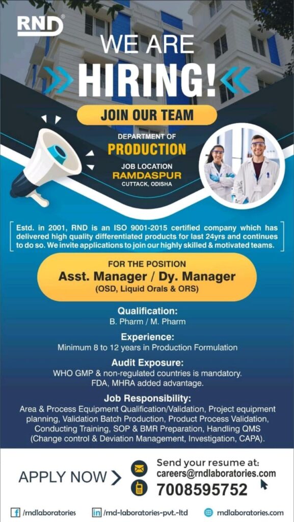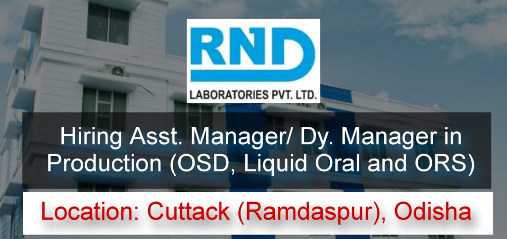 RND Laboratories Pvt. Ltd. Cuttack (Ramdaspur), Odisha hiring Asst. Manager/ Dy. Manager in Production (OSD, Liquid Oral and ORS) Apply Now