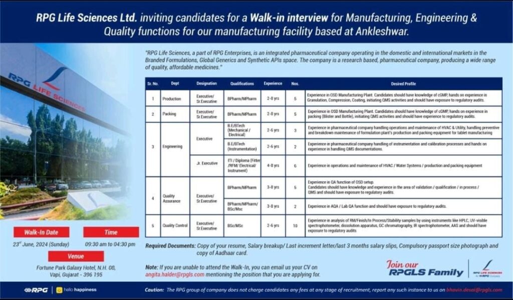 RPG Lifesciences Ltd, has organized Walk-in Interview for it’s OSD Manufacturing plant based at Ankleshwar, Gujarat.