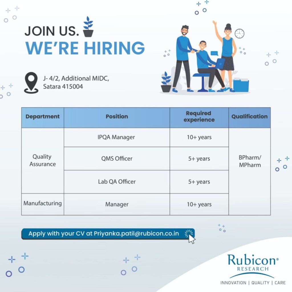 Rubicon Research, a leading pharmaceutical innovation company, is inviting applications from skilled and experienced candidates for various positions in Quality Assurance and Manufacturing departments.