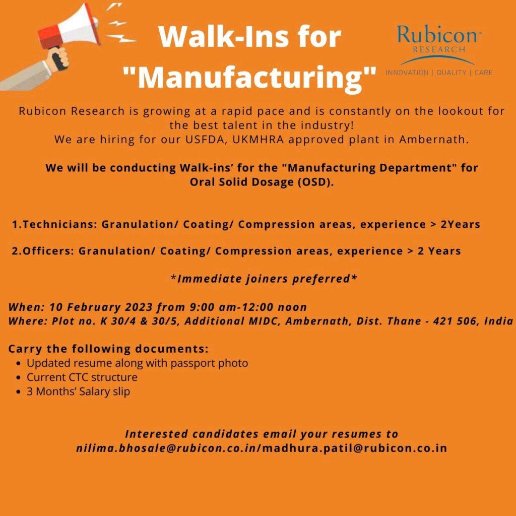 Rubicon Research- Walk-ins’ for the “Manufacturing Department” for Oral Solid Dosage (OSD) on 10th February 2023