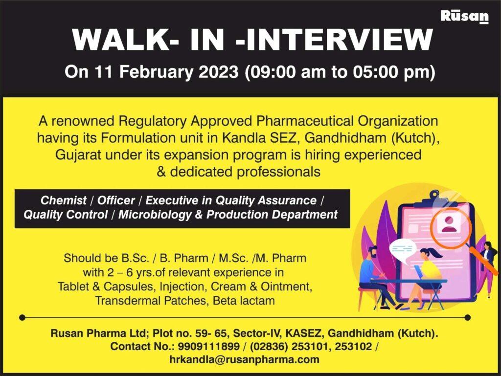 Rusan Pharma Ltd- Walk In Interview Chemist/Officer / Executive in Quality Assurance / Quality Control / Microbiology & Production Department on 11th February 2023