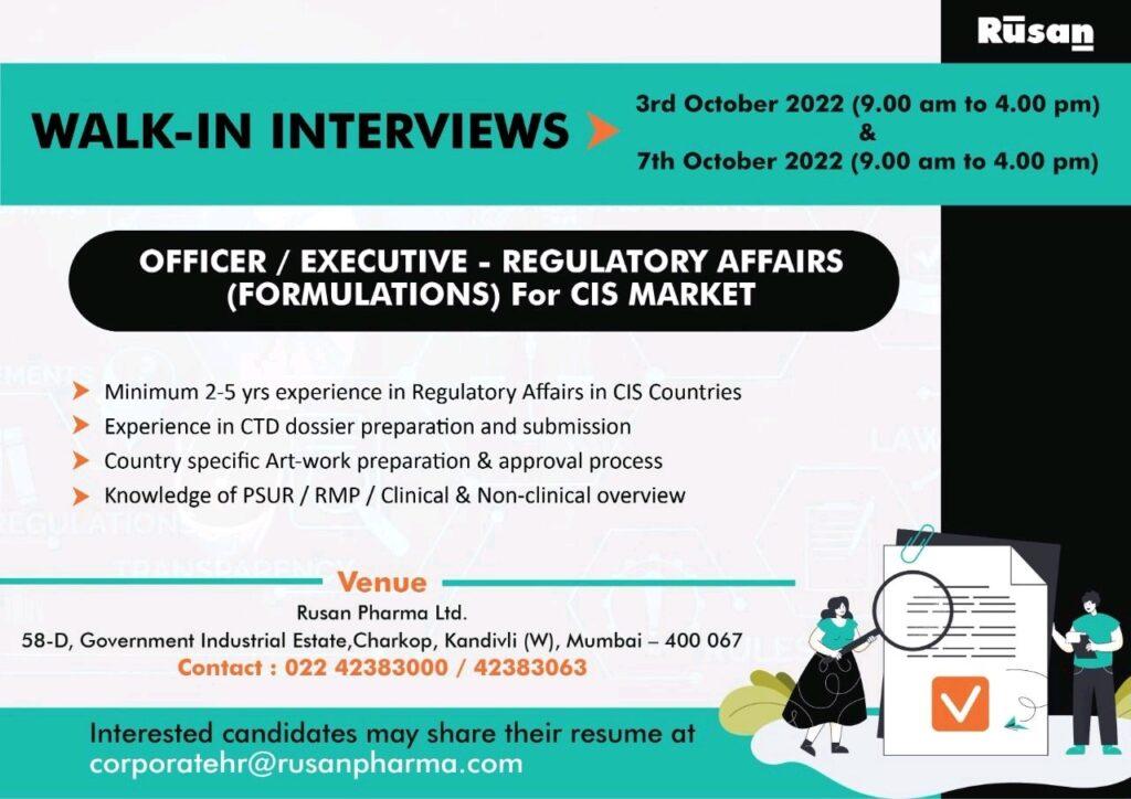 Rusan Pharma Ltd. Walk In Interview for Officer/ executive- Regulatory Affairs (Formulations) on 3rd & 7th October 2022