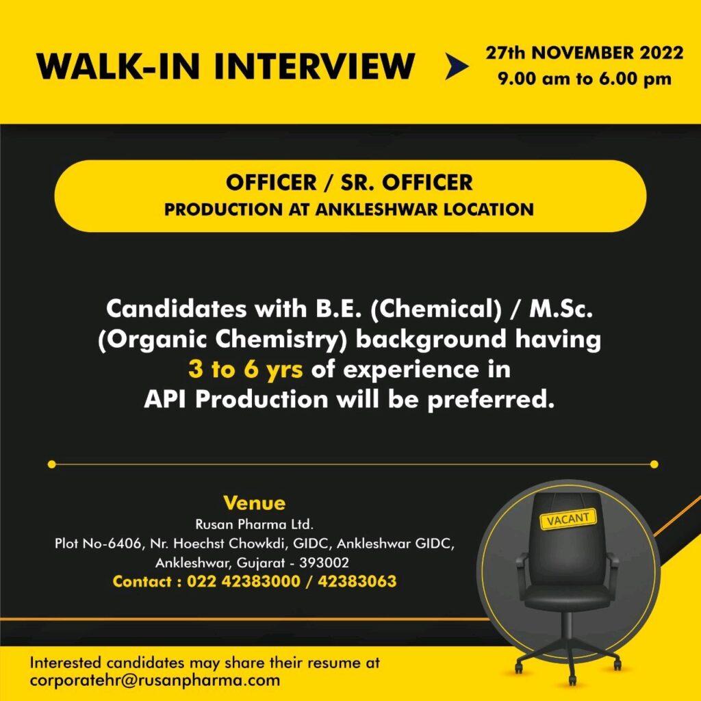 Rusan Pharma Ltd. Walk In Interview for Officer/ Sr. Officer – API Production on 27th November 2022