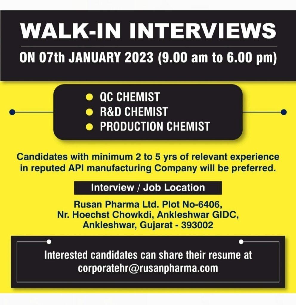 Rusan Pharma Ltd- Walk In Interview for QC, R&D, Production on 07th January 2023