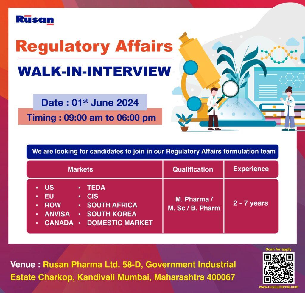 Rusan Pharma Ltd walk in interview for Regulatory Affairs on 01st June 2024